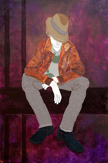 Theresa Wells Stifel's Mixed Media piece "Take 5" is actually a portrait of her teenage son George. "George's 'leather' jacket is actually made of old sheet music his boots of real leather and his skin and other clothing from fabric. In fact his t shirt in the painting is a snip out of an outgrown favorite t shirt that George inherited from our good friend Elizabeth Loftis."
